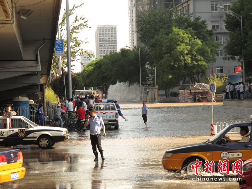 2010年5月25日下午4点半左右,北京京广桥附近发生水管爆裂,水柱喷射到两层楼高,流出的水已成河,造成东三环严重拥堵。沈军 摄