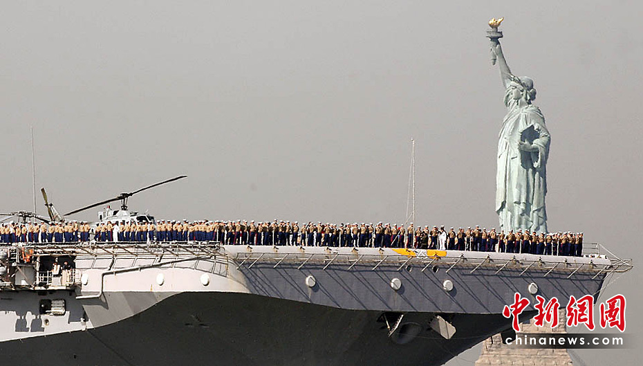 当地时间5月26日,美国第23届纽约舰队周开幕,包括“硫磺岛”号两栖攻击舰在内的11艘参加舰队周活动的军舰由南向北在哈得孙河面上游弋。纽约民众将以停靠在曼哈顿哈得孙河86号码头的“无畏号”航母博物馆为中心,展开为期一周的庆祝和纪念活动。图片来源:中国新闻网