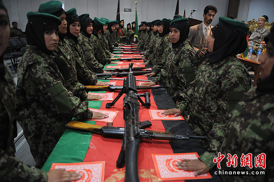 当地时间5月27日,阿富汗首批女军官在首都喀布尔举行毕业宣誓仪式。这是阿富汗军队征召女兵计划的一部分,按照计划她们将根据各自受教育程度被赋予不同的职位:接受过12年以上教育的女兵将担任文职官;接受过9年到11年教育的将担任军士长;受教育程度更低的女兵则只能当列兵。图片来源:中国新闻网