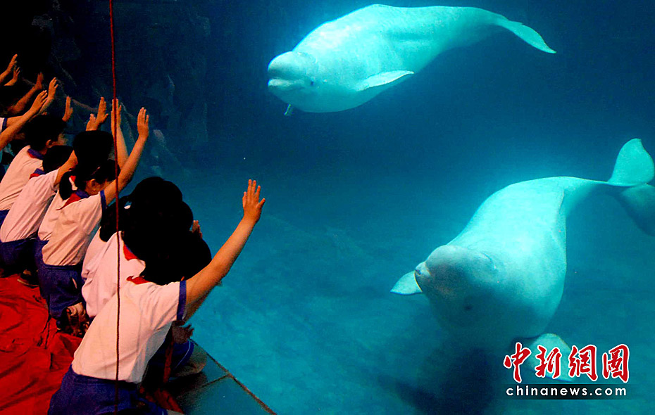 5月28日,北京海洋馆从俄罗斯引进的两头极地白鲸首次与游客见面。同时,北京海洋馆举办“携手‘北极精灵’,共倡低碳生活”环保公益活动,呼吁人类应该保护海洋环境,保护珍惜物种。中新社发 张宇 摄