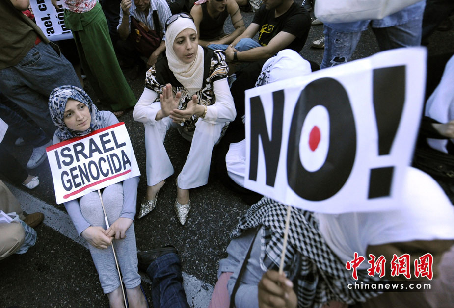 以色列海军31日对国际人道救援船队发动袭击,船上至少有9名支持巴勒斯坦的活动人士被以军打死,众多国家和国际组织纷纷表示“震惊”,多国民众走上街头,对袭击事件表示抗议。图为在西班牙马德里,民众在街头游行抗议。