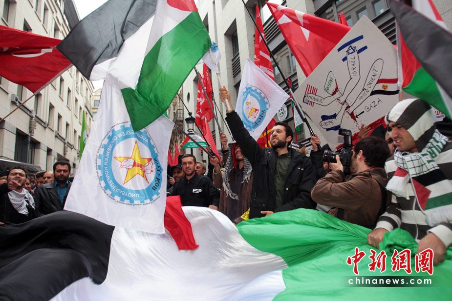 以色列海军31日对国际人道救援船队发动袭击,船上至少有9名支持巴勒斯坦的活动人士被以军打死,众多国家和国际组织纷纷表示“震惊”,多国民众走上街头,对袭击事件表示抗议。图为在比利时布鲁塞尔,民众在街头游行抗议。