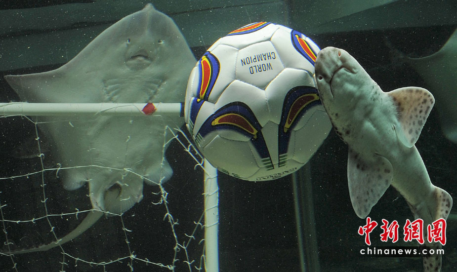 当地时间6月15日,德国北部,水族馆里的海洋生物争抢填满饲料的足球。