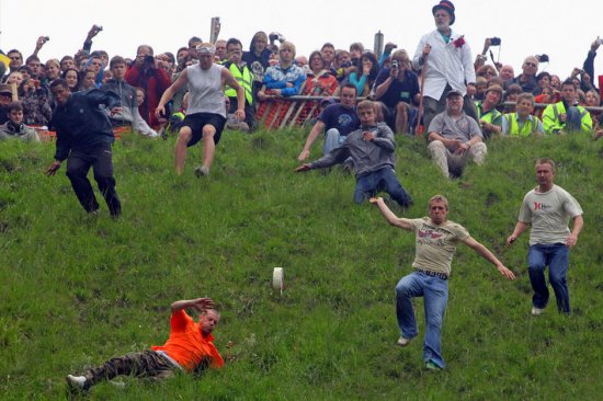 5月26日,在英国格洛斯特郡库珀山举行的滚奶酪比赛上,参赛者奔跑追逐从山坡上滚下的巨型奶酪,最先追到者获胜。一年一度的滚奶酪比赛是英国格洛斯特郡的一项传统赛事,至今已有200多年历史,但由于山坡陡峭光滑,比赛中常有人受伤。