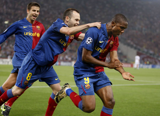 北京时间5月28日凌晨,第54届冠军杯决赛在罗马奥林匹克球场打响,最终巴塞罗那以2比0击败曼联,第3次夺得冠军杯,并成为冠军杯、西甲与国王杯“三冠王”。图为打进第一球的巴萨球星埃托奥,疯狂庆祝进球。