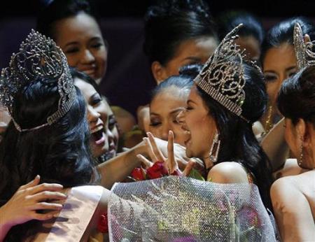 2009年新科菲律宾世界小姐Marine-Ann Umali与众佳丽拥抱庆祝。