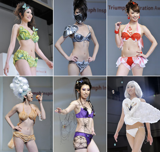 5月25日,日本东京举办了一场内衣创意设计大赛,作品风格新奇搞怪,有白菜、圣女、金鱼、天鹅、蜘蛛、甚至洋葱等多种造型,火辣的模特配以怪异的内衣,令观众大饱眼福。