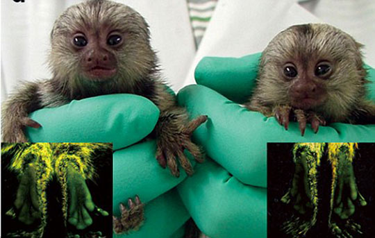 据英国媒体28日报道,近日,日本研究人员宣布培育出了一种转基因绒猴,这种猴的发根、皮肤和血液在特定光线照射下都会发出荧光。