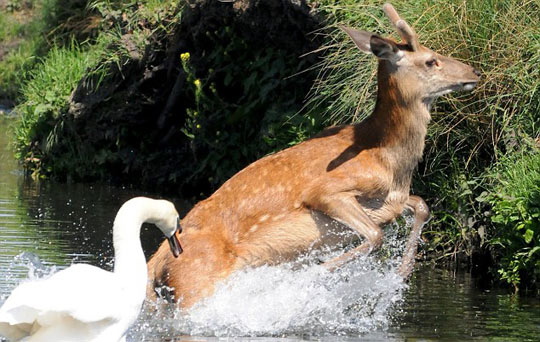 组图:凶悍天鹅公园湖中与小鹿抢地盘(4)