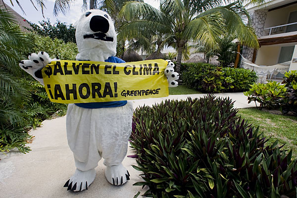 图为6月4日,在墨西哥绿色和平组织环保主义者扮成北极熊的模样呼吁环保。