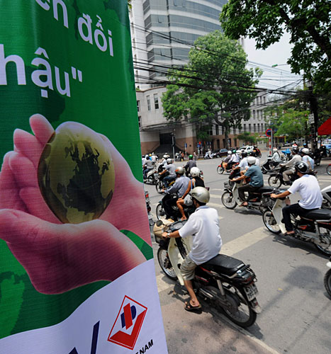 图为6月5日,在越南首都河内的大街上到处悬挂着世界环境日的宣传海报。