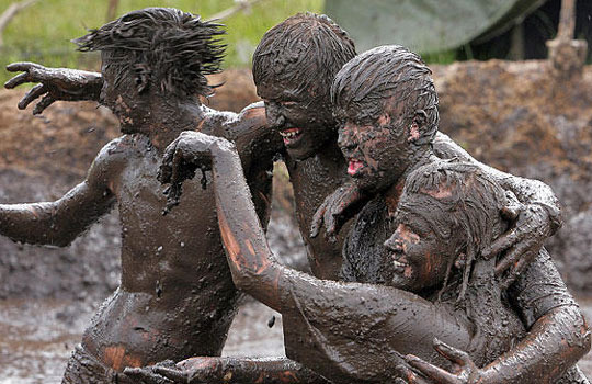 6月13日,为期两天的立陶宛维尔纽斯国际音乐节开幕,这是波罗的海沿岸国家最大的音乐艺术节日,吸引众多民众前来狂欢。图为在维尔纽斯一座城堡附近,参加国际音乐节的人们在身上涂满泥巴,撒欢狂欢。