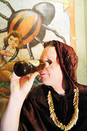 美国伊利诺伊州一名外号叫南瓜头(Pumpkinhead)的男子20年前因为癌症痛失左眼,20年的独眼生活不仅让南瓜头学会了用左眼窟窿喝啤酒,而且抽烟时还能用左眼吞云吐雾。(图片来源:重庆晚报)