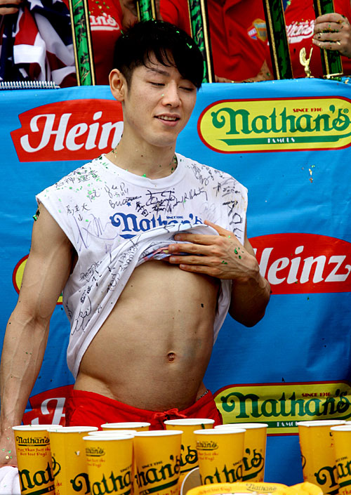 7月4日,美国纽约科尼岛举行一年一度的吃热狗大赛,来自美国加利福尼亚州的“大胃王”乔伊·切斯特纳特以10分钟连吞68个热狗的成绩蝉联冠军。吃热狗大赛是纽约庆祝7月4日美国独立日的传统特色活动之一。