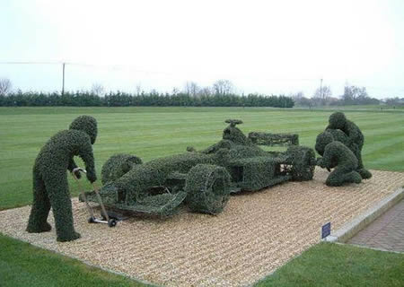 独具匠心的F1方程赛车草雕,这种题材前所未见,也许园林的主人是个F1车迷,模拟比赛时换胎的紧张瞬间,生动传神。