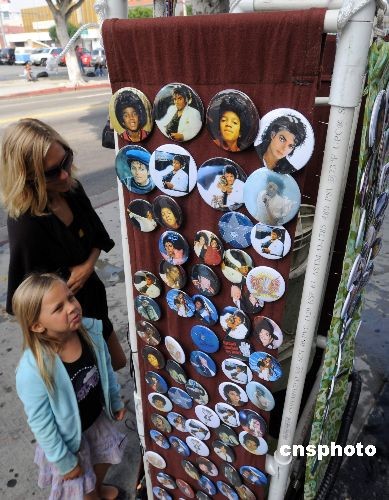 七月七日上午,迈克尔·杰克逊的公众悼念活动在洛杉矶斯坦普斯体育中心举行。预期场外可能出现的数十万歌迷自发悼念的情形没有出现,在体育中心附近的匹克大道与南花街交界处聚集人群最多,也只有数百人,而且包括众多媒体记者和小贩。原本想大赚一笔的小贩大失所望,纷纷降价甩货。图为一个兜售迈克尔·杰克逊纪念章的摊贩前顾客寥寥。中新社发 张炜 摄