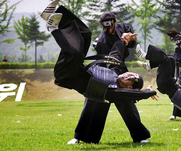 7月8日,韩国特种部队出动男女特种兵进行了跆拳道格斗术演练及特技表演。近日,朝核危机以来韩国三军部队频频进行军演。