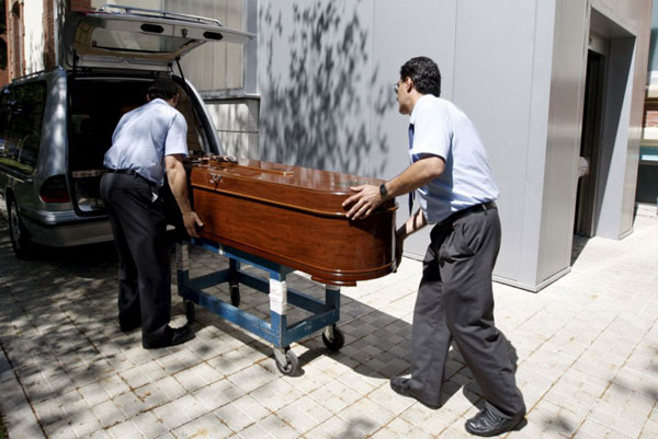 据英国媒体报道, 在西班牙邦布罗纳地区举行的奔牛节10日传出噩耗,27岁西班牙青年罗梅洛被牛角刺伤颈部及肺部不治,另有9人受伤,其中3人遭牛角戳伤,6人于奔牛过程受轻伤,这是近14年来奔牛节活动首次有人死亡。 图为工作人员正在运送不幸死亡的青年罗梅洛的棺椁。