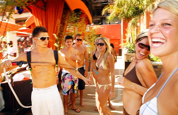 在美国赌城拉斯维加斯的威尼斯人赌场饭店,有一个独一无二的露天泳池,它没有幽静的花园,也没有海豚表演,在这里只允许成人入内,在泳池入口,有工作人员负责检查每个人的身份证,以防止未成年人进入。这里每个周末都会举行狂欢Party。