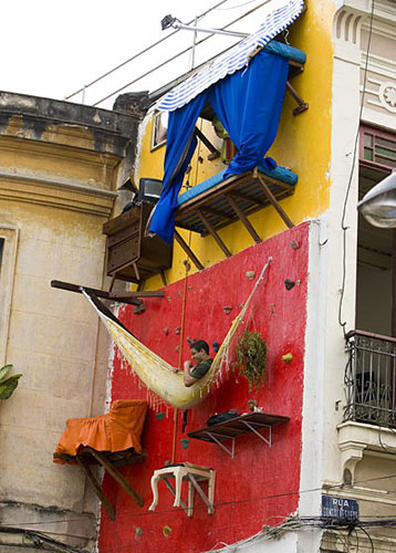 当地时间7月10日,在巴西里约热内卢,艺术家加布里埃尔·普里莫躺在墙上的吊床里休息。他不仅楼房的外墙上安装了家具和生活用品,而且从09年5月23日起就生活在这面墙上。以此传达一种新的居住理念。