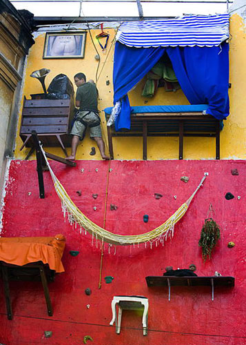 当地时间7月10日,在巴西里约热内卢,艺术家加布里埃尔·普里莫躺在墙上的吊床里休息。他不仅楼房的外墙上安装了家具和生活用品,而且从09年5月23日起就生活在这面墙上。以此传达一种新的居住理念。