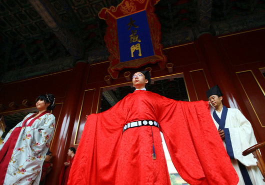 2009年7月8日上午8点30分,北京市高考状元刘庭梅、宁少阳在孔庙和国子监博物馆参加成人礼,向父母、师长、祖国行传统礼,标志着自己由成年迈向成人。(图片来源:CFP)