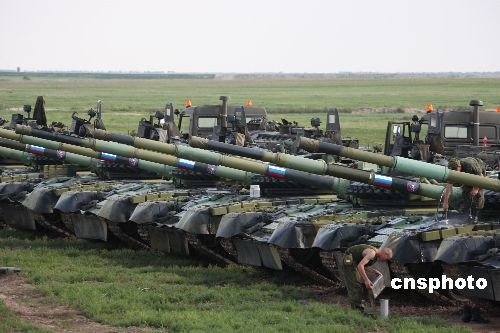 7月14日,参加“和平使命-2009”中俄联合反恐军事演习的中俄双方参演部队人员和装备,通过摩托化机动、铁路和空中输送的方式,全部在演习地域集结完毕。中新社发 张雷 摄
