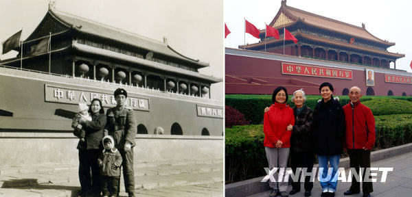 左图为1958年在部队工作的应德毅(右)与妻子章锦芳带着3岁的应左娃(左一)和6岁的应代娅在天安门前留影;右图为2009年,已成为教师的小女儿应左娃(左一)和曾留学德国并就职于西门子的大女儿应代娅(左三)再次与父母应德毅(右一)、章锦芳在天安门前留影。黑明 摄(黑白照片为资料照片)