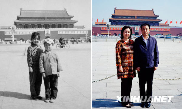 左图为1970年,9岁的马洁和6岁的弟弟马刚在天安门广场合影;右图为2009年,在银行工作的马洁和在公安局工作的马刚再次在广场上留影。黑明 摄(黑白照片为资料照片)