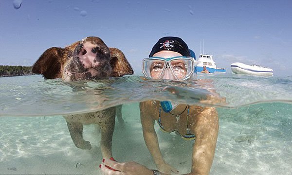 “我不太清楚这些家猪(其实是野生的)是怎么在巴哈马这片特别的沙滩上生存的。但是当地人非常熟悉他们,常年给他们喂食。”