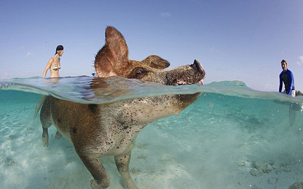 程先生说:“我们的一位摄影师纳丁?阿姆斯切德,她觉得跟这些猪相处太愉快了,最后干脆与它们一起游了以来。”