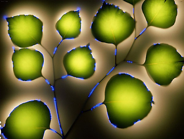 据英国媒体近日报道,美国摄影师伯特-布尔特曼花费10年心血拍摄了令人惊异的植物通电照片。这些照片是电流穿过金属板,而金属板顶部放置着植物,在这种条件下拍摄植物通电的情景。