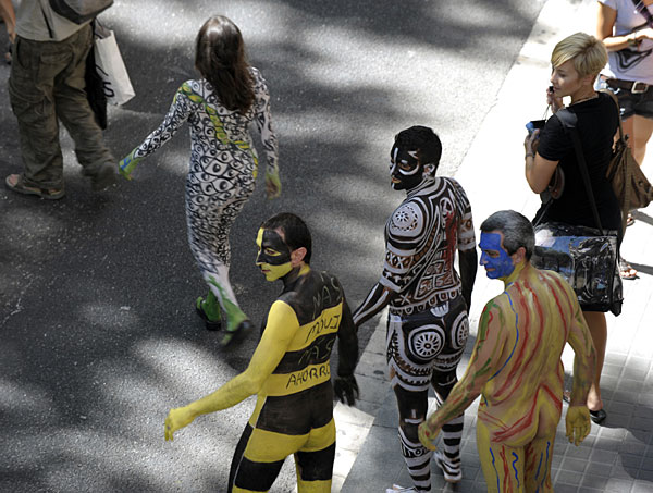 西班牙巴塞罗那市中心7月18日举行了街头人体彩绘表演。赤裸上身漫步并展现人体彩绘的女子,引来众人目光。