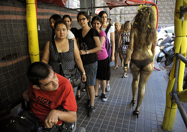 西班牙巴塞罗那市中心7月18日举行了街头人体彩绘表演。赤裸上身漫步并展现人体彩绘的女子,引来众人目光。