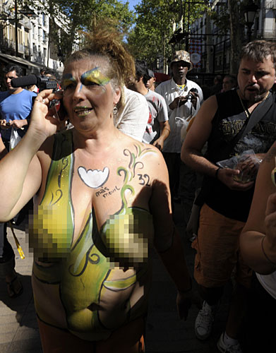 西班牙巴塞罗那市中心7月18日举行了街头人体彩绘表演。赤裸上身漫步并展现人体彩绘的女子,引来众人目光。