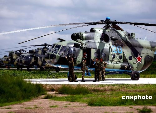 参加“和平使命2009”联合反恐军事演习的俄罗斯军队直升机群,7月20日在机场待命。这支部队在演习中担负着地面攻击配合、投送兵力、医疗救护等任务。这次演习,双方以陆军和空军为主,中方参演部队包括1个陆军战斗群和1个空军战斗群。俄方参演兵力包括1个陆军加强摩步营、1个空降突击连和部分空军兵力。这将是中俄两军继“和平使命2005”、“和平使命2007”之后,在上海合作组织框架下举行的又一次大规模反恐演习。中新社发 宋吉河 摄
