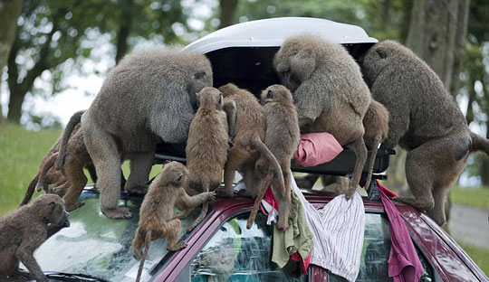 据英国媒体21日报道,英国诺斯雷野生动物园的游客已经接到警告,因为这里出现了一群会“洗劫”你车顶旅行箱的“强盗狒狒”。它们对箱子内的东西都很好奇,包括衣服、鞋子甚至内衣都是这些狒狒的“寻宝”对象。