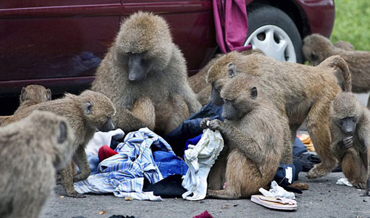 据英国媒体21日报道,英国诺斯雷野生动物园的游客已经接到警告,因为这里出现了一群会“洗劫”你车顶旅行箱的“强盗狒狒”。它们对箱子内的东西都很好奇,包括衣服、鞋子甚至内衣都是这些狒狒的“寻宝”对象。
