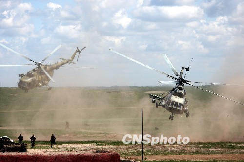 7月21日,参加“和平使命—2009”联合反恐军事演习的俄方参演部队进行分练,中方参演部队予以配合。在80分钟的分练中,进行了 “联合封控、立体突破、机动歼敌、纵深围剿”等内容达到了预期的效果。俄方加强步兵营、空降兵突击连和参演的俄空军各种战机参加了分练。 中新社发 张雷 摄