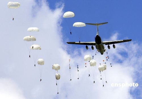 7月21日,参加“和平使命—2009”联合反恐军事演习的俄方参演部队进行分练,中方参演部队予以配合。在80分钟的分练中,进行了 “联合封控、立体突破、机动歼敌、纵深围剿”等内容达到了预期的效果。俄方加强步兵营、空降兵突击连和参演的俄空军各种战机参加了分练。图为俄军伞降。 中新社发 张雷 摄