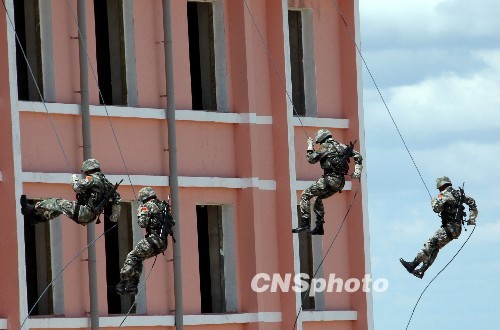 7月21日,参加“和平使命—2009”联合反恐军事演习的俄方参演部队进行分练,中方参演部队予以配合。在80分钟的分练中,进行了 “联合封控、立体突破、机动歼敌、纵深围剿”等内容达到了预期的效果。俄方加强步兵营、空降兵突击连和参演的俄空军各种战机参加了分练。 图为中方特种兵楼顶索降解救人质。中新社发 张雷 摄