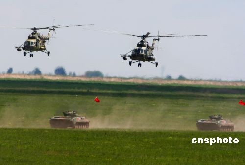 7月21日,参加“和平使命—2009”联合反恐军事演习的俄方参演部队进行分练,中方参演部队予以配合。在80分钟的分练中,进行了 “联合封控、立体突破、机动歼敌、纵深围剿”等内容达到了预期的效果。俄方加强步兵营、空降兵突击连和参演的俄空军各种战机参加了分练。中新社发 宋吉河 摄
