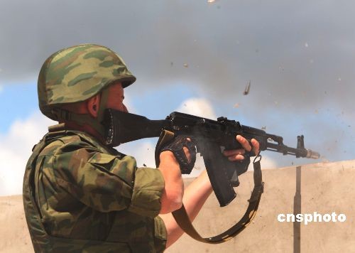 7月21日,参加“和平使命—2009”联合反恐军事演习的俄方参演部队进行分练,中方参演部队予以配合。在80分钟的分练中,进行了 “联合封控、立体突破、机动歼敌、纵深围剿”等内容达到了预期的效果。俄方加强步兵营、空降兵突击连和参演的俄空军各种战机参加了分练。中新社发 宋吉河 摄