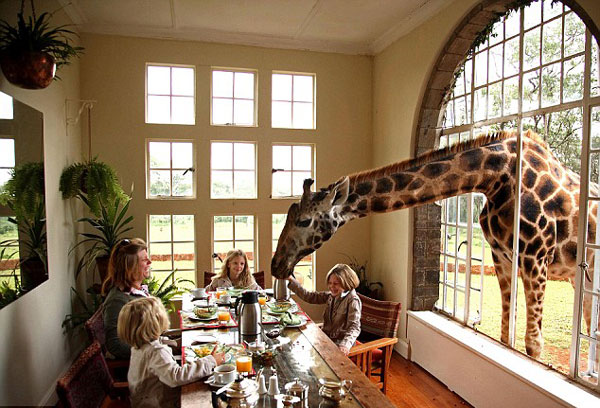 据英国媒体21日报道,肯尼亚的一个家庭多年来把八只长颈鹿当做自己的家庭成员,一起生活。当游客们到此时,不仅可以与长颈鹿亲密接触,甚至可以同长颈鹿同吃同住。这些稀有长颈鹿其高度都超过16英尺,重量超过2吨,预期可以活到30岁。