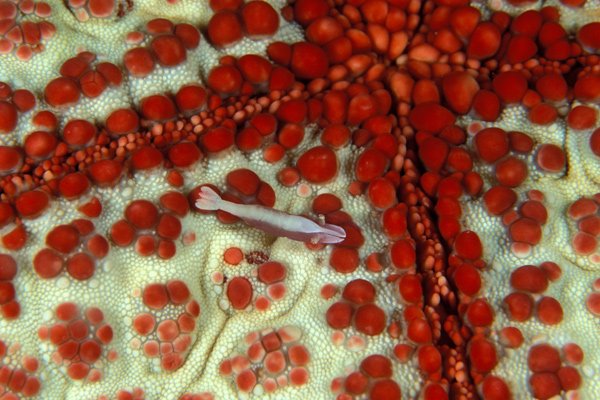 在印度洋津巴布韦北部海岸,生活在红白面包海星中心的一只小虾。