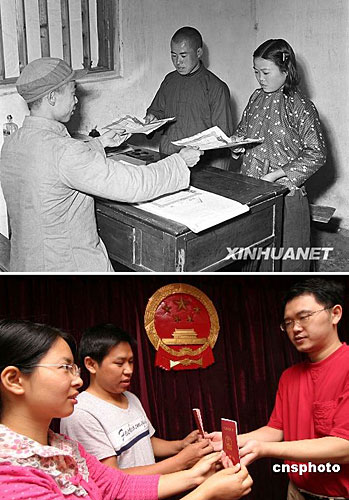 上图:1952年11月9日,湖南省醴陵县白兔潭村农民全裕盛(中)和孙桂华(右)向区政府登记结婚,司法干部把结婚证书递给他们。(图片来源:新华网)