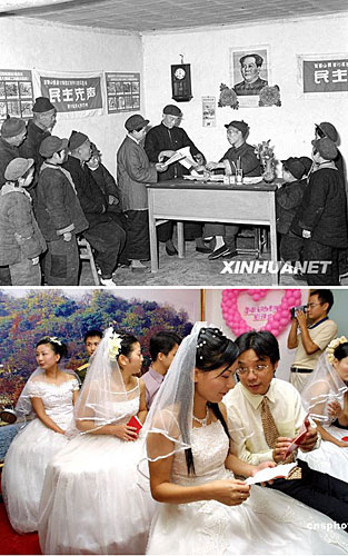 下图:2003年10月1日是中国新《婚姻法》实施的第一天。新《婚姻法》规定结婚双方婚姻法只要携带身份证、户口本和结婚申请书便可办理结婚登记,取消了旧婚姻法中结婚双方单位开具证明的规定。(图片来源:中新网 吴煌 摄)
