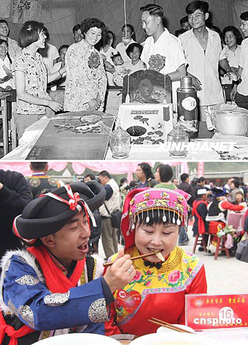下图:2009年4月26日,四川省北川县政府在擂鼓镇吉娜羌寨为20对“5·12”大地震后重组家庭夫妇举行集体婚礼。婚庆活动结束后,新人们将前往海南,享受政府提供价值10万元的厚礼——三亚五日蜜月旅行。(图片来源:中新网 郭国权 摄)