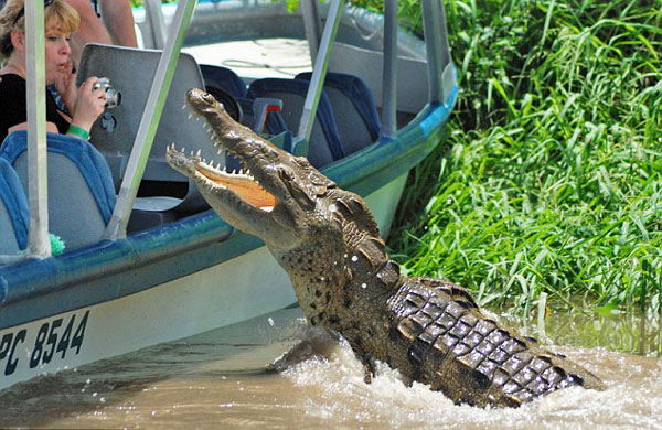 据英国媒体29日报道,近日,在哥斯达黎加旅游的一名业余摄影师用相机捕捉到鳄鱼张开血盆大口,欲袭击另一条船上游客的惊魂一刻。当时一名德国女游客和鳄鱼近在咫尺,险些命丧鳄鱼之口。
