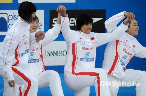罗马时间7月30日晚上,罗马世锦赛女子4×200自由泳颁奖仪式上,中国夺金选手杨雨、朱倩蔚、刘京、庞佳颖跃上奖台。中新社发 廖攀 摄